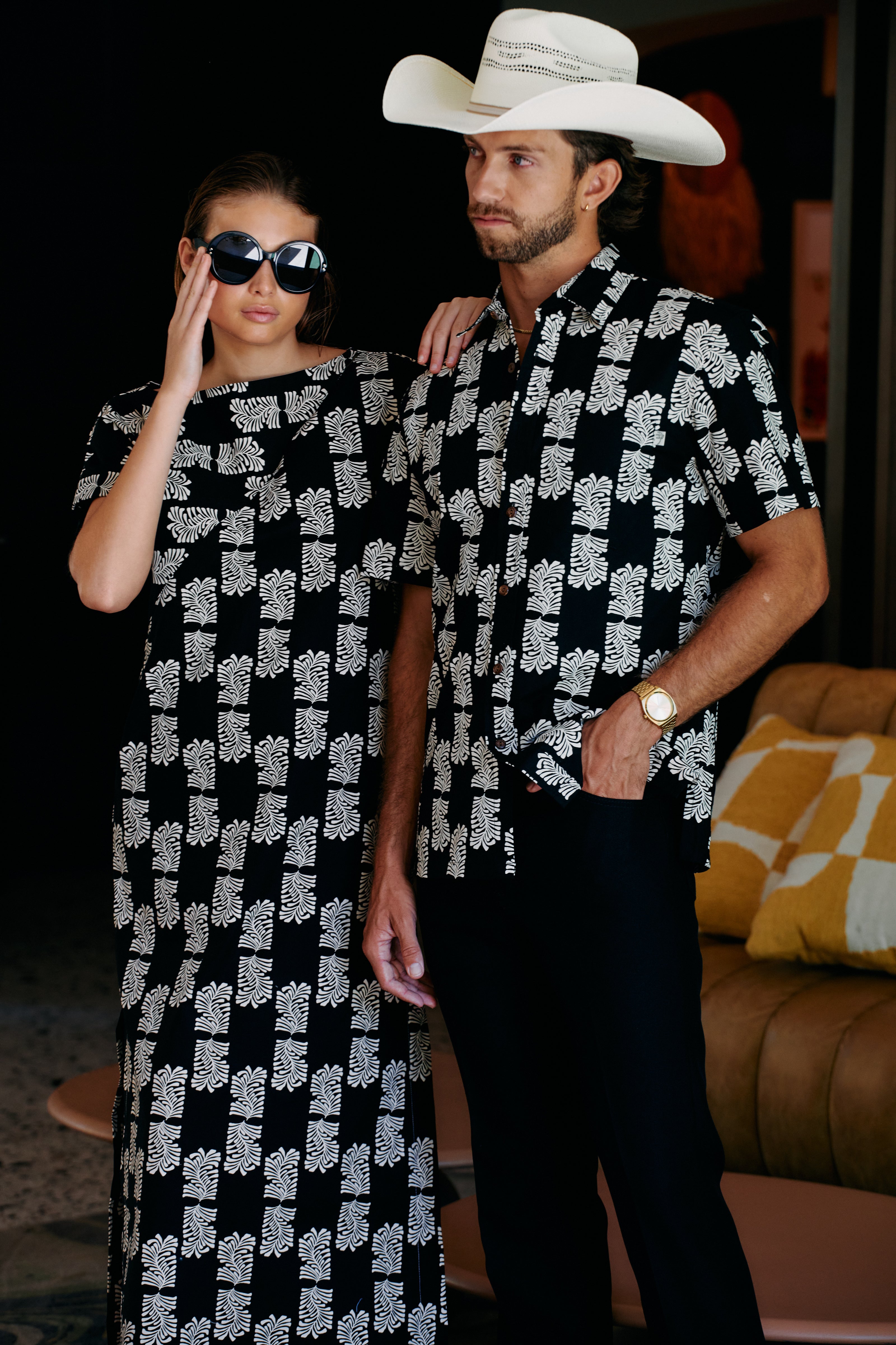 Loose lines and an oversized print make this an easy go to, worn casually open over a swim suit, or buttoned up days running errands.