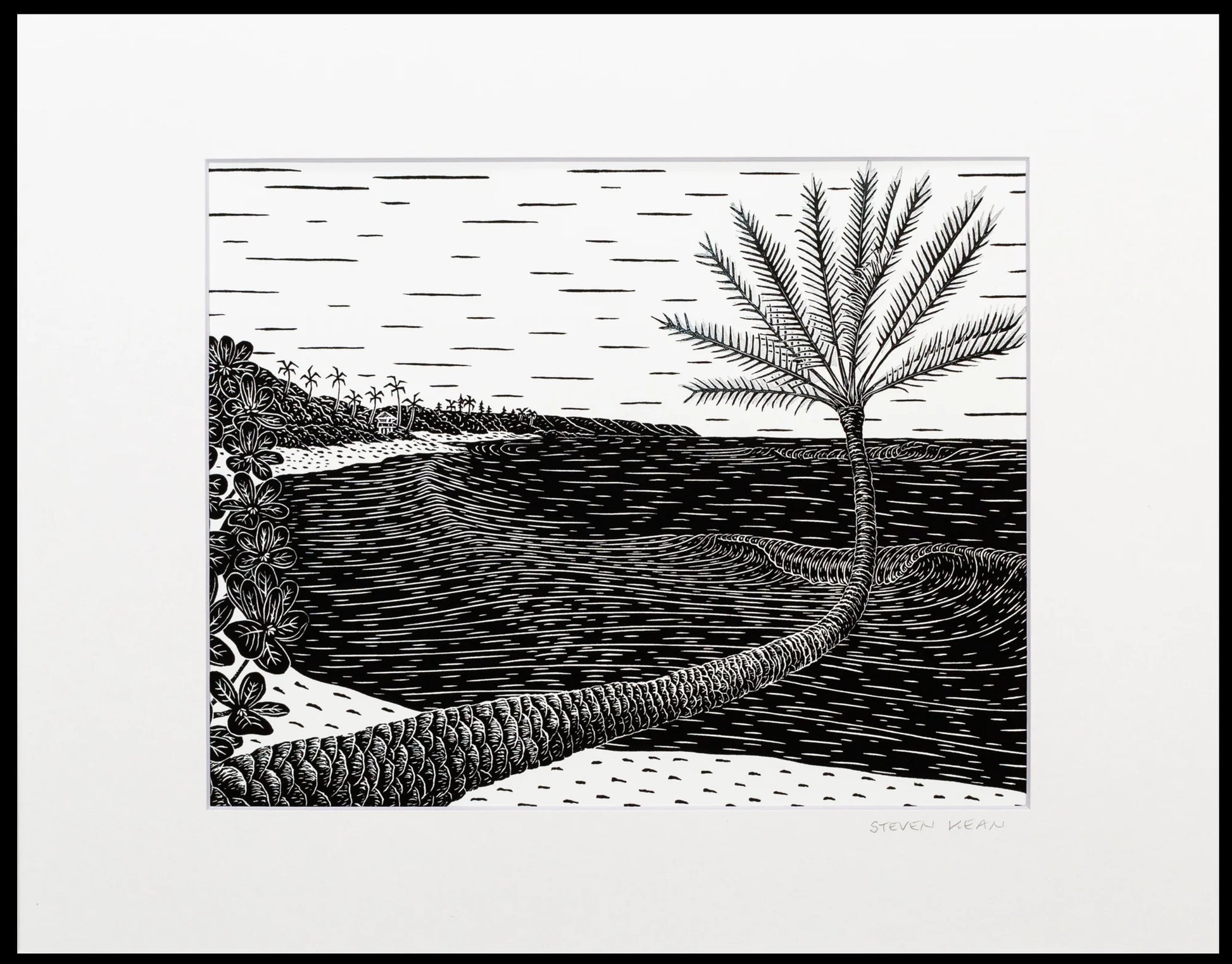 The Palm Tree at Sunset Beach is said to be over 100 years old. It also happens to be one of the most photographed Palms on the planet. Kean stepped out of his comfort zone in this piece; adding to the technicality of the work is a second block that was carved, printed with gray ink on top of the existing layer of black ink.