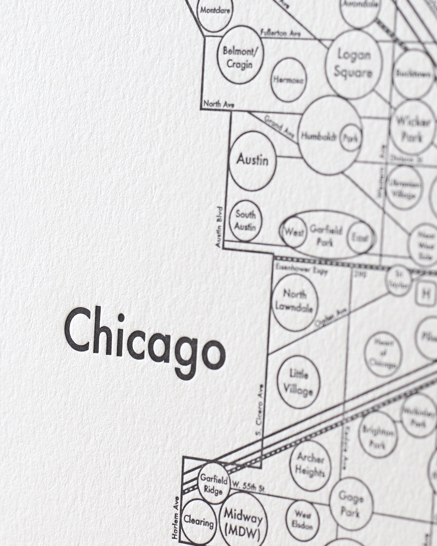 "Chicago exploded in population during the late 19th century, and chose to construct a spoke-and-wheel streetscape that still stands today. It never really grew into that idealized form, but you can see how it was heading in that direction. Everything starts downtown within the loop and emanates out at 45 degree intervals. This neighborhood map is meant to be both beautiful and useful." -Archie