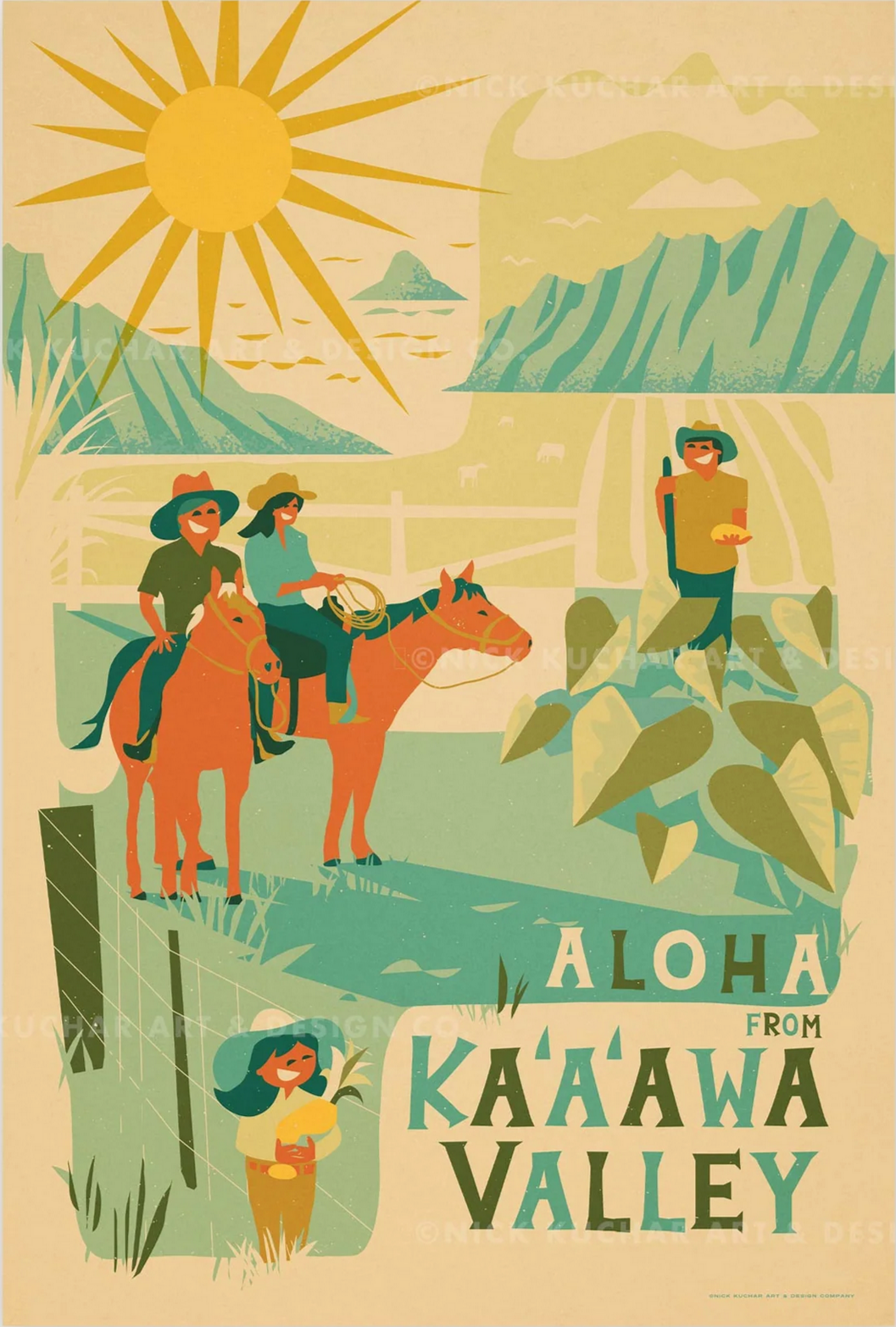 Nick's Commentary: "I wanted to celebrate the paniolo and farmer culture with this print. There's so much majesty up in Ka‘a‘awa and Kualoa valleys on the windward side that this became a montage to honor those things: living off of the land, cattle, and horses from mauka to makai."