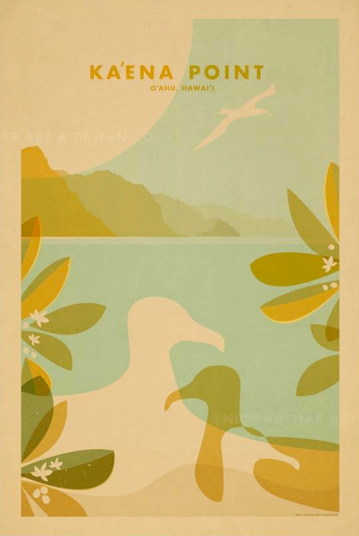 Nick Commentary: "I had a lot of fun creating this print because it's one of my favorite places. It's a surreal experience to hike to the northwest tip of O‘ahu and watch huge albatross fly overhead. When there's a big north swell, the monstrous waves rolling in are a spectacle. Here I've hiked, mountain biked, driven in a 4x4 and just sat appreciating the mana of this area."