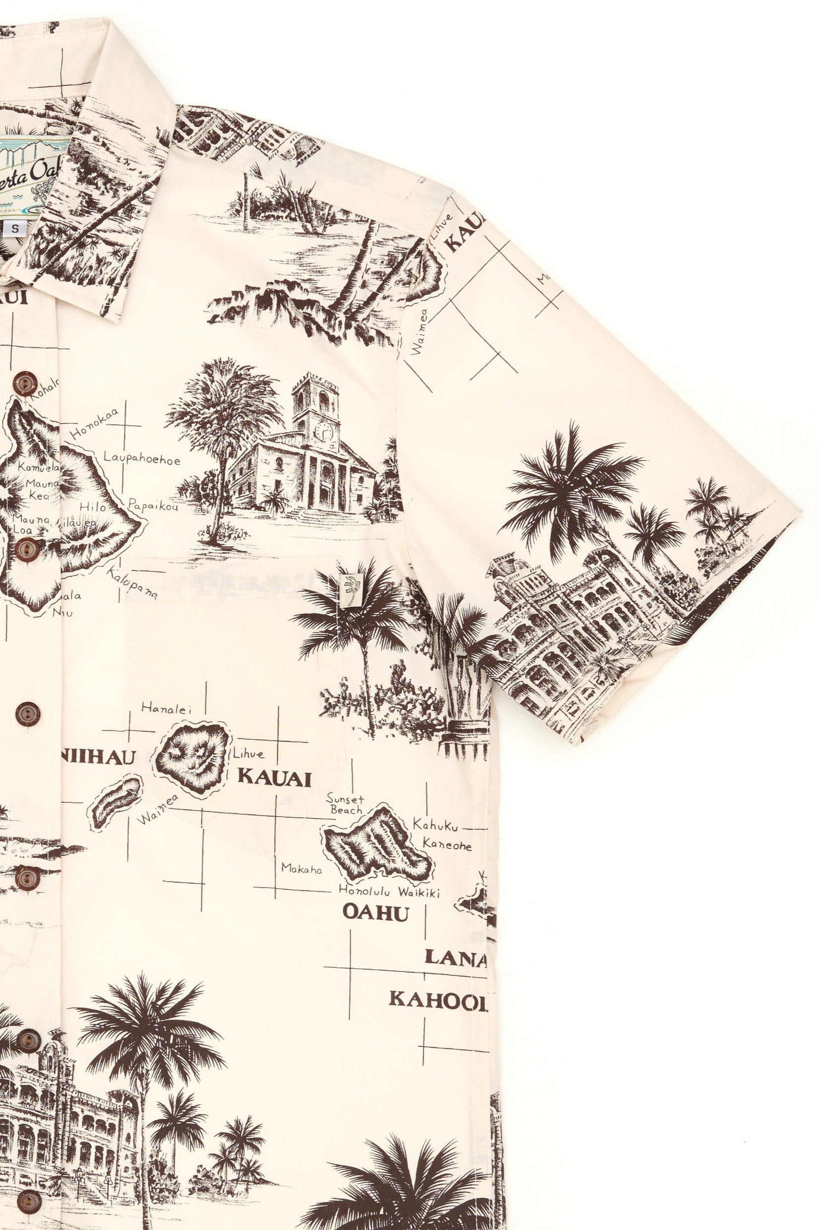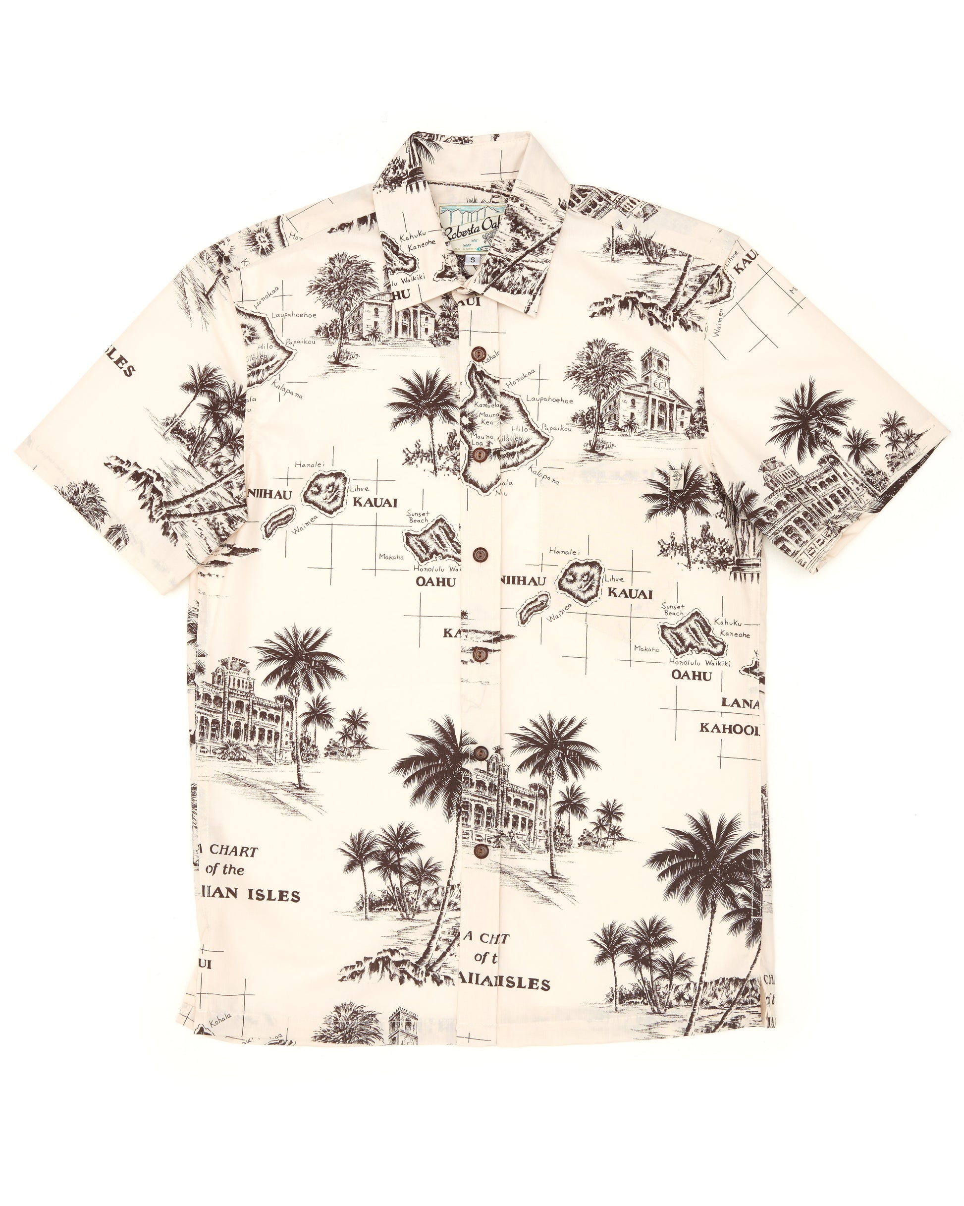 Each shirt is made in Hawai‘i from a rare, vintage textile, no longer in production, giving Navigation Ivory its unique character and timeless appeal. With its soft ivory base and subtle nautical motif, this shirt channels laid-back island sophistication with a nod to adventure.